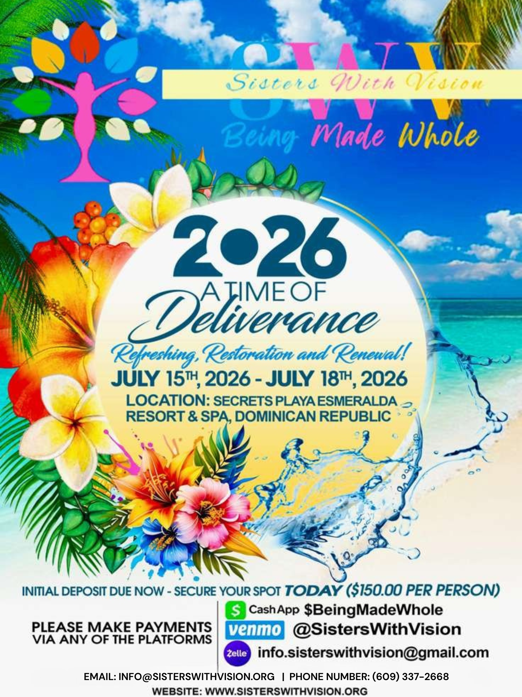 SAVE THE DATE and make plans to join us for our 4th "Being Made Whole Retreat" in the Caribbean. It will be a time of Deliverance, Refreshing, Restoration and Renewal. Registration for this event will open in May 2025. Please check back then.Read More